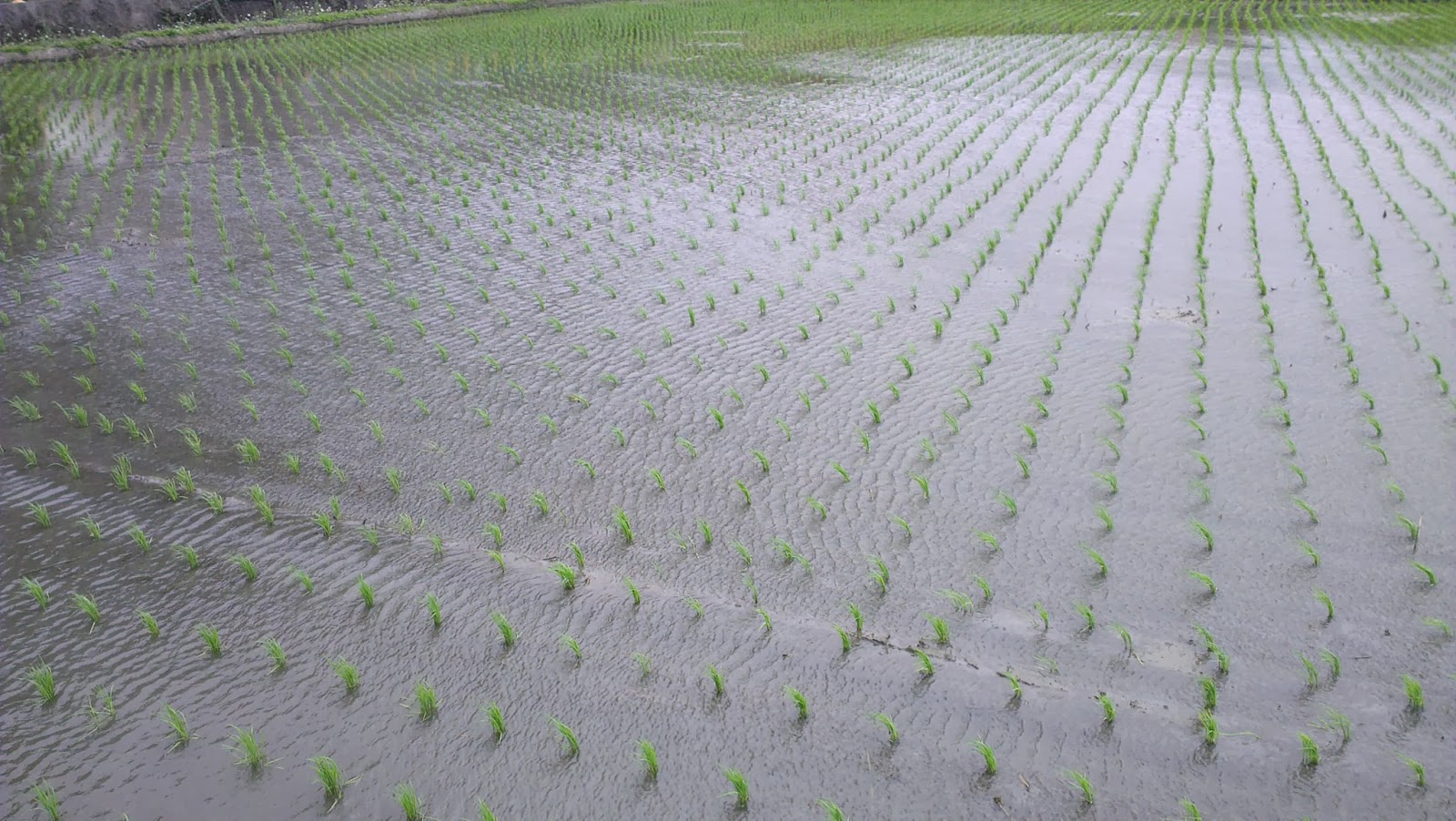 腳趾到小腿的水溫好暖(眼尖看到左鄰右舍的阿伯和阿婆遠遠在看我在田裡補秧)