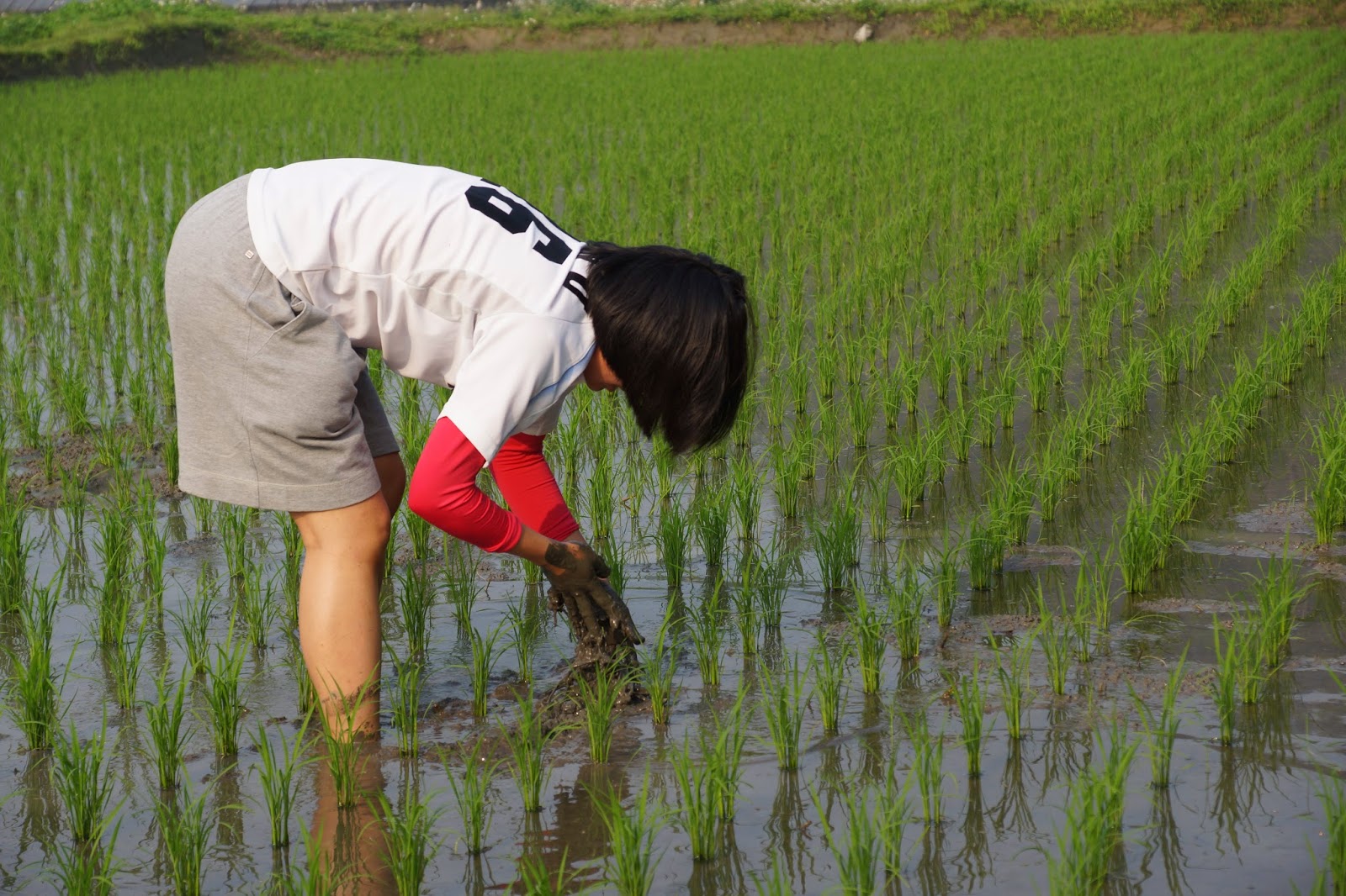 今天動作算是很快就下田了(之前總是會尋覓"好位置"下田,以免踩到會蠕動的蟲…,害怕阿),可能有了少少的兩次下田經驗,以及習慣下田就是要這樣麻煩,所以也就沒再考慮太多包袱一腳踩進田裡,開始找草拔草,也因為一直彎著腰,比之前更近距離的觀察秧苗長的模樣(雖然除了長高,我沒看出什麼特別,只看到幾株白子!),然後發現泥土被太陽曬過後,很溫暖踩起來很舒服。