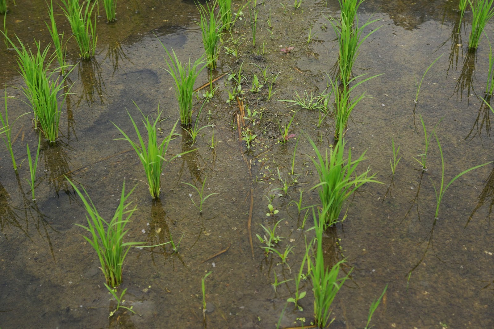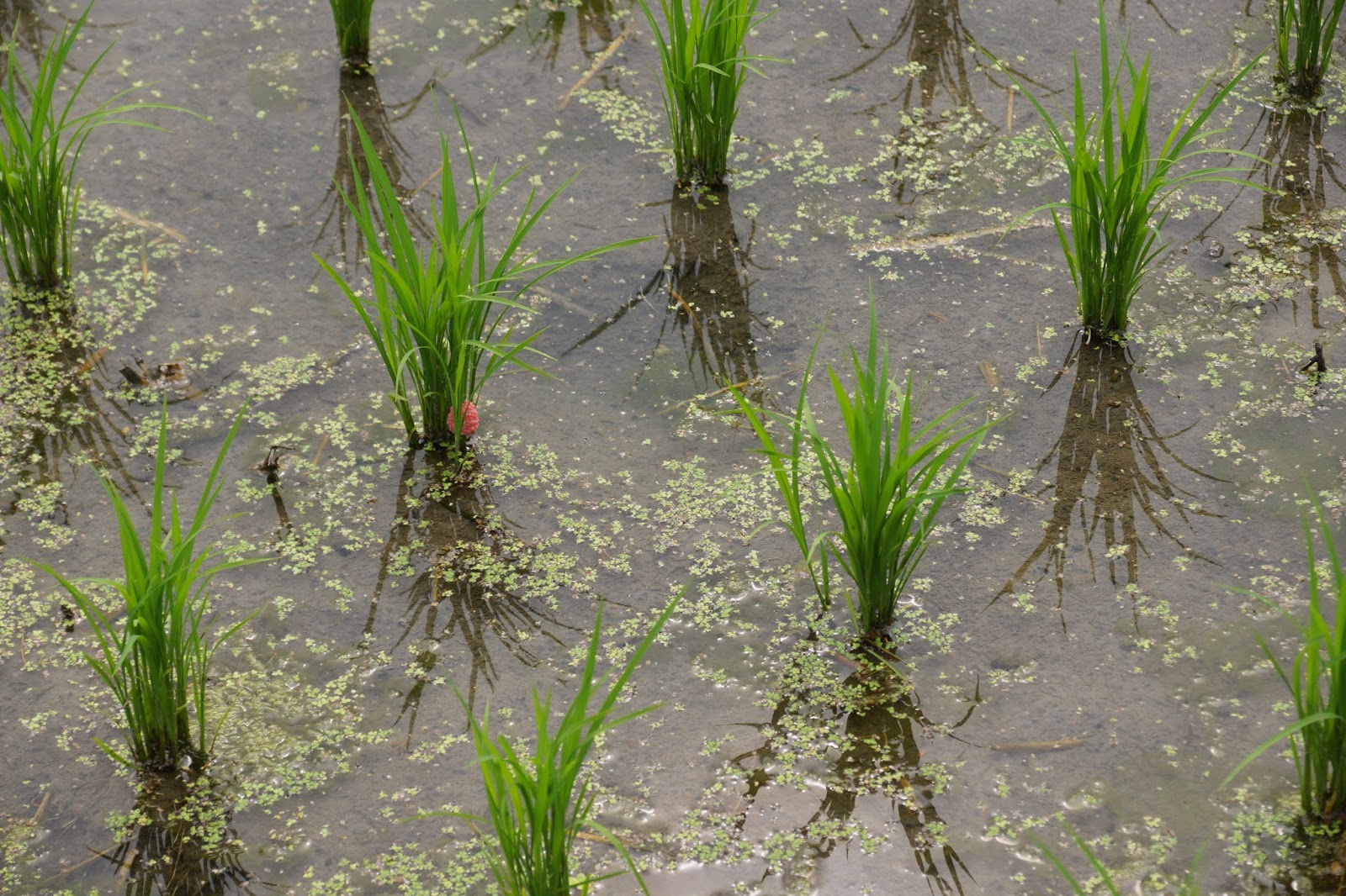 種水稻的兩大危機,當你的田裡佈滿水,你會遇到的危機是福壽螺大軍壓進,當你的田沒水,陽光照射土壤,你面對的危機是遍地開花的雜草,除都除不完,兩種危機如果用人力來解決都很絕望,但如果用農藥除草劑來解決都很輕鬆。有沒有一個方法可以同時克服這兩種問題?福壽螺是幼小水稻的剋星,正確來說稚嫩的水稻苗是福壽螺的最愛,種一整片根本是大餐,但是水稻苗長大一定程度大小的時候,莖夠硬時,福壽螺就咬不下去,福壽螺不總是水稻的天敵,而雜草,最怕的就是跟水稻搶養份跟搶陽光,這樣結的穗不多,會影響收成。水多福壽螺多,但雜草不容易長,且容易清除;無水沒福壽螺,雜草迅速增長,且不容易除。或許折衷的方式就是剛播水稻苗的時候,每天放水跟排水,然後花點時間天天去挲草,當水稻苗夠高的時候,將水放滿,一來水稻苗夠高,不會被水泡到軟腳也不會被福壽螺啃,同時水夠高,雜草發不起來,嫩嫩的雜草也會變成螺的食物。