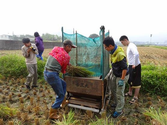 這天是金海伯的田區手工收割的日子。前幾天先請機器來收了七分的田地,我們像去年一樣,留下一分地,邀請大家一起來手工收割,希望對農有興趣的人能到田裡一起來體驗農務、親近田區。而今天來了很多暨大的同學,許多人都是第一次到這裡…