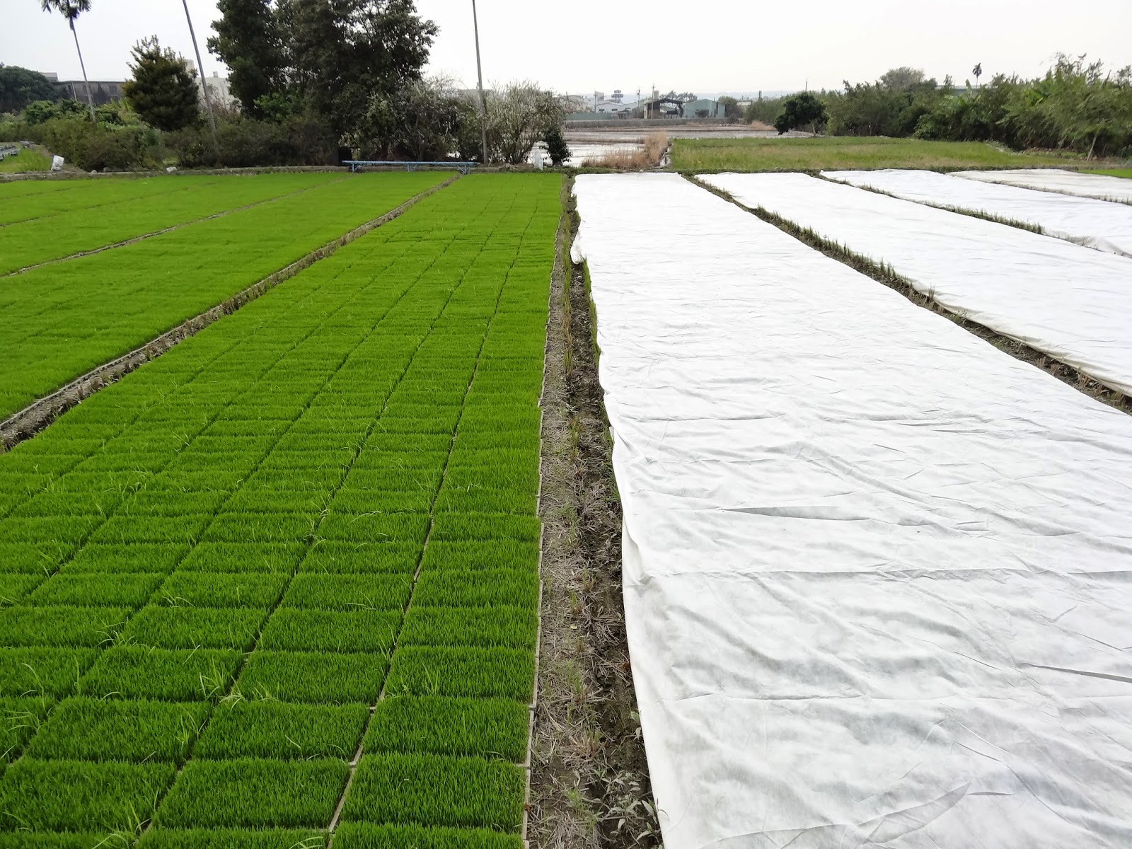 | 一邊是蓋著不織布保暖的幼苗 |