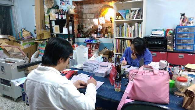 森葳和流浪咖啡師立昕在我們租屋處一樓的大桌上準備隔日出貨的標籤紙。 |